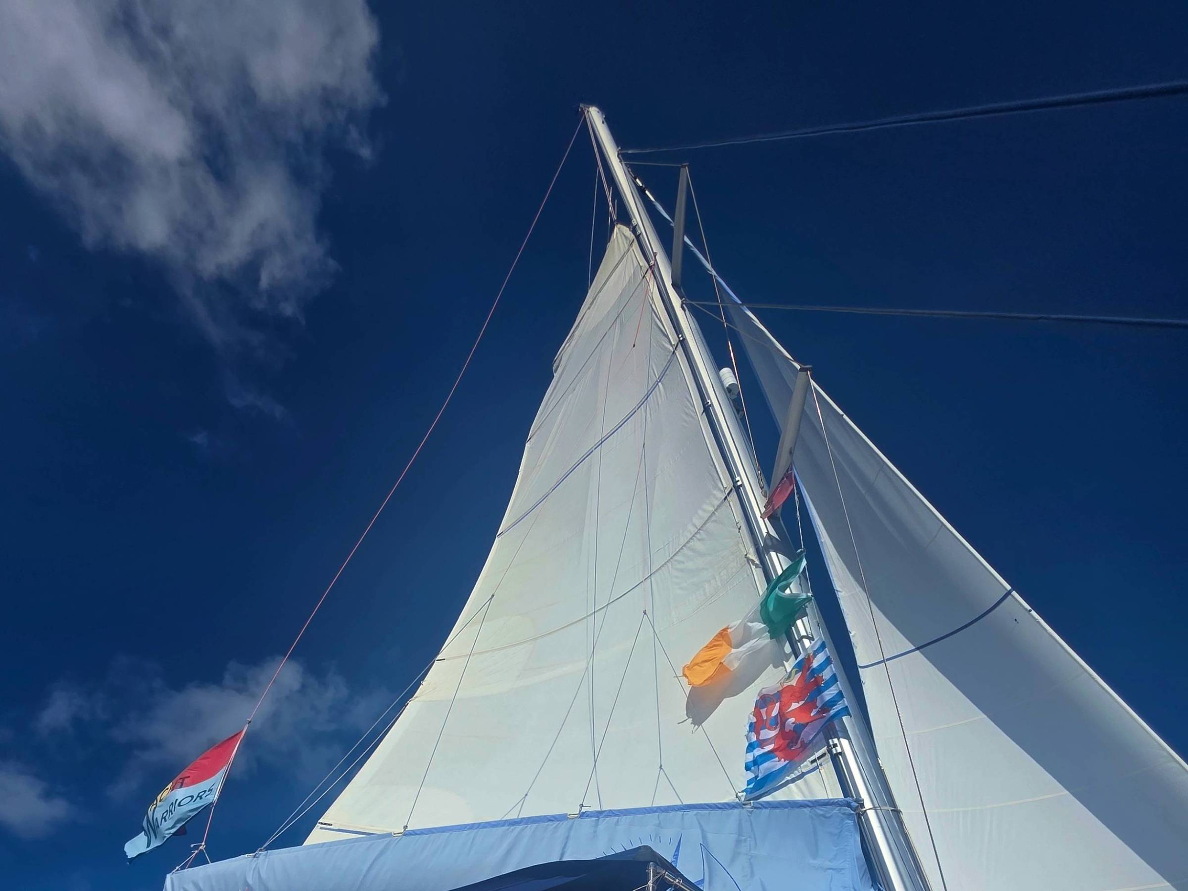 Flying to Anegada at 9-10 knots with 2x reefs in the main (Irish flag of course for St Patty's Day)
